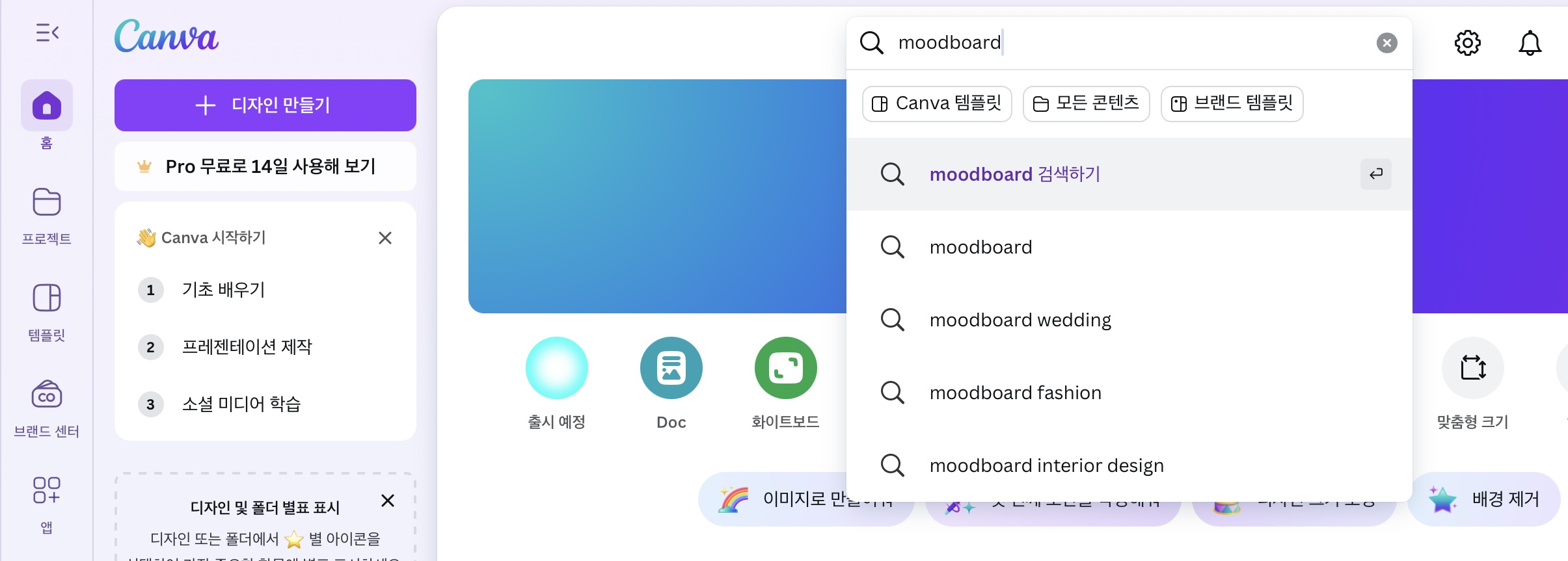 - 캔바 홈 상단 검색창에 ‘무드보드’, ‘컨셉 보드’, 또는 ‘moodboard’ 입력