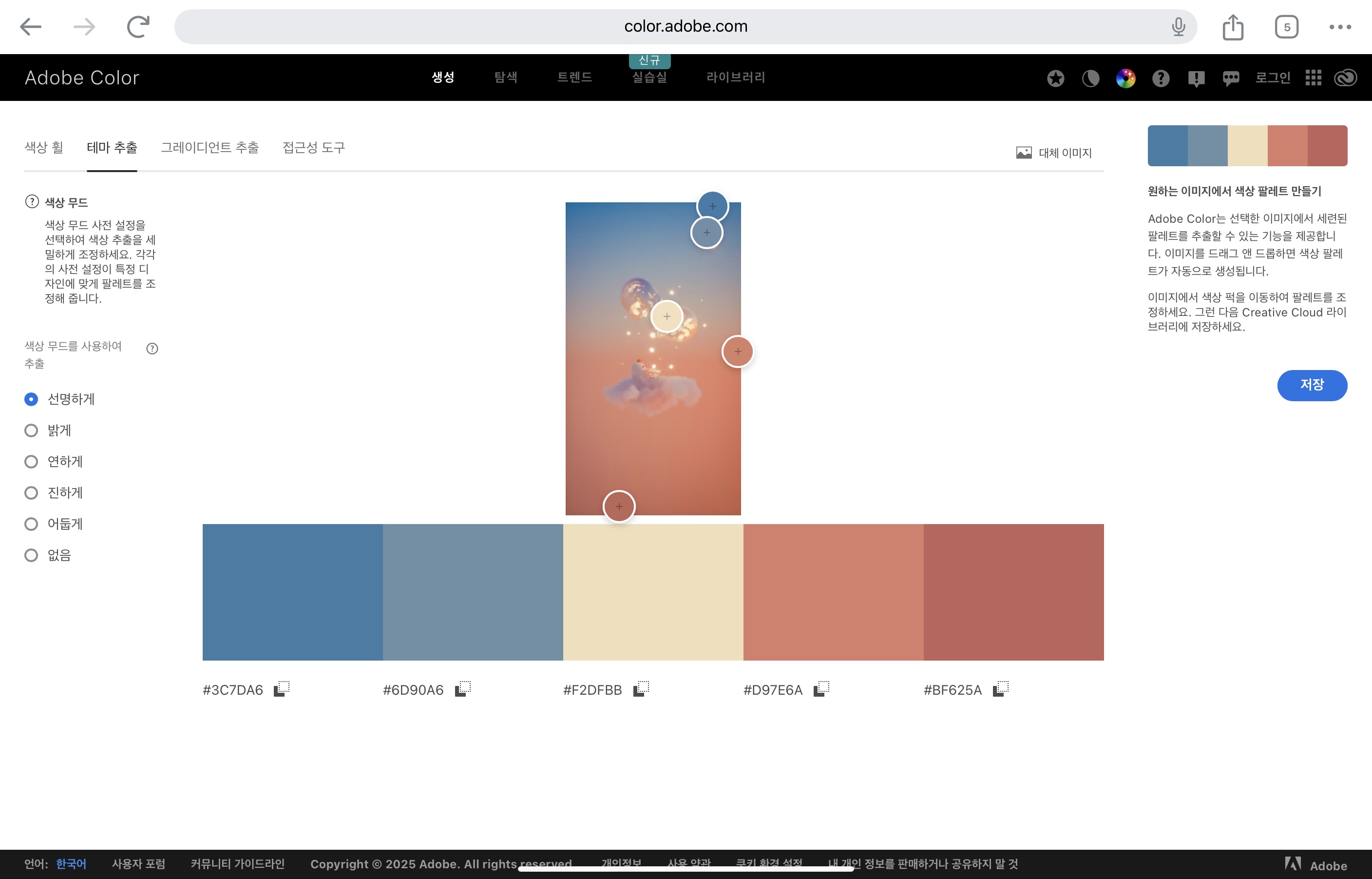 사진을 올리면 Adobe Color가 자동으로 5가지 컬러를 추출해줘요.