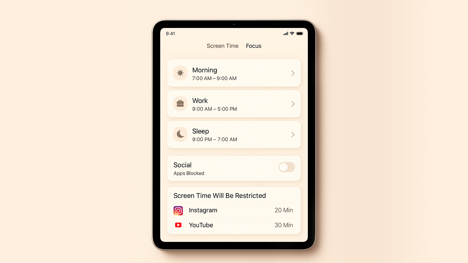 - iPad 설정 → 집중 모드 → 새 포커스 + → ‘Morning’ 생성